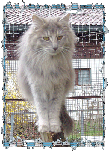 Wir schauten regelmässig (5-6 in der Woche smile) auf ihre Homepage. Finchen entwickelte sich super. Ich nahm meinen ganzen Mut zusammen und telefonierte mit Silvia. Wauuuuu!! Ich konnte es kaum fassen, dass wäre kein Problem Finchen zu uns nach Hause zu bringen, sagte Silvia. Am 2.10.2005 nach ca. 700 km kamen Silvia, Steffen und Finchen bei uns an. Ohhhh!! Sie ist noch hübscher als auf den Foto`s. Die anderen Katzen kamen alle um Finchen zu betrachten. Die Einzige, die alle andern Katzen anfauchte und knurrte war Finchen :)))) Nach vier Tagen spielten bereits alle Katzen zusammen. Finchen ist extrem verschmust, sehr verspielt, liebevoll und sehr anhänglich. Ihre Neugier lässt nichts unendeckt, egal wie hoch und wie eng es ist, wird erforscht. Sie lässt sich gerne Kraulen, dabei lässt sie ihren lauten Schnurrmotor an.
